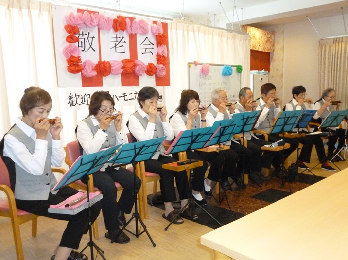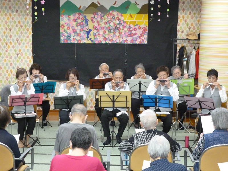 誕生会に参加して懐かしい歌謡曲、童謡唱歌など10曲を演奏しました。皆さんにも4曲を歌ってもらい会場は元気いっぱい楽しい雰囲気。ハーモニカの調べに涙する方もいました。