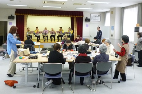 お集まりの皆さんは、写経や編み物、マスコットつくりなどをしながら歌って演奏を聴いてくださいました。